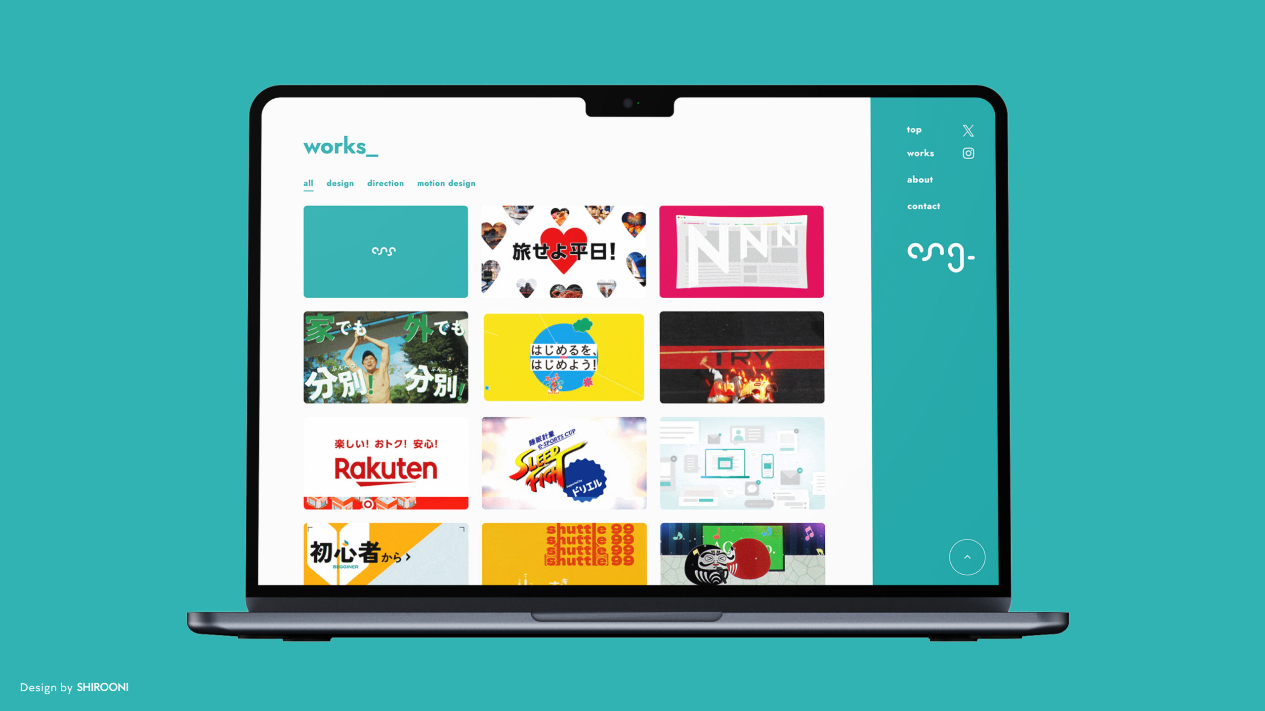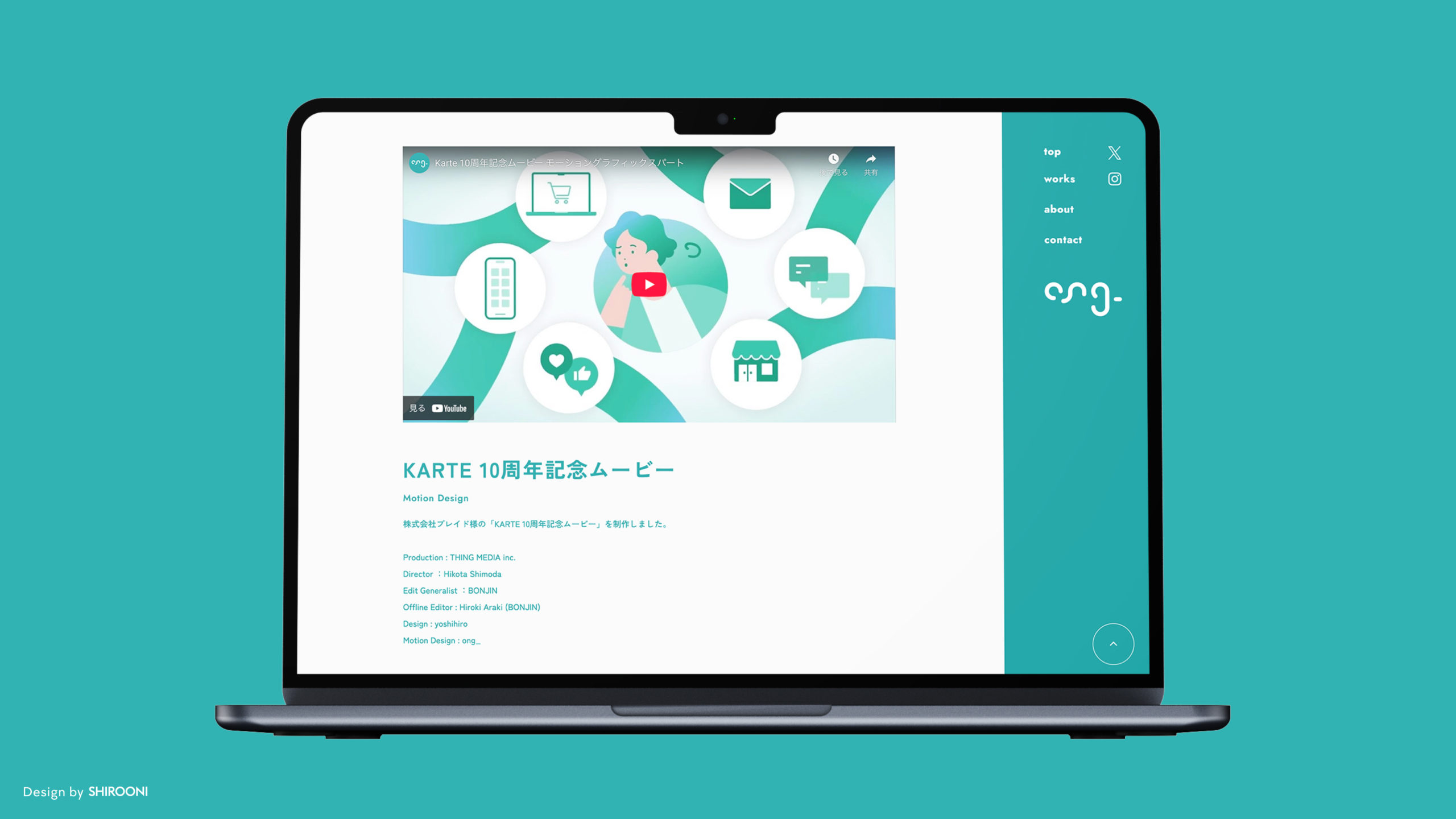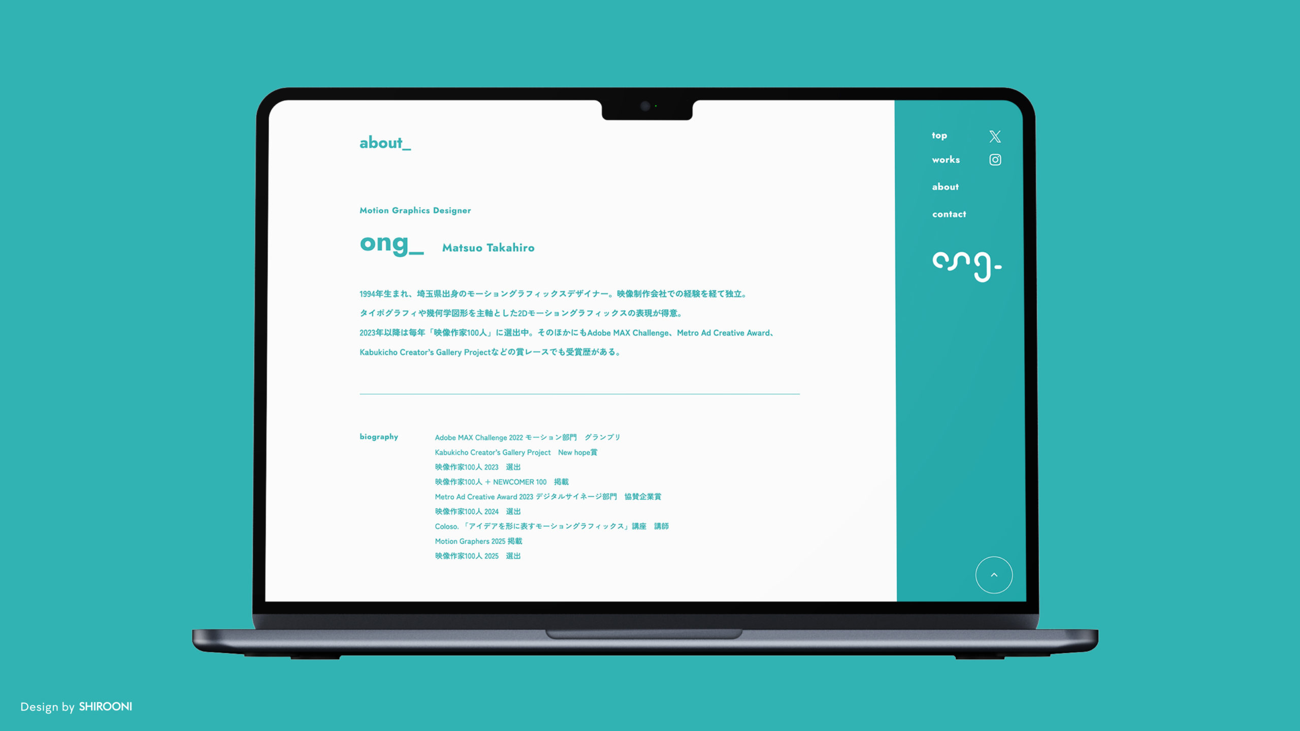 motion graphics designerのong_様のWEBサイトを制作いたしました。モーションデザインを魅力的に見せるサイトにしようと思い、TOPページで各実績動画が自動再生するサイトにしました。